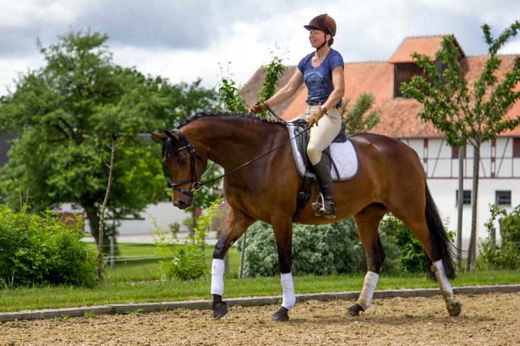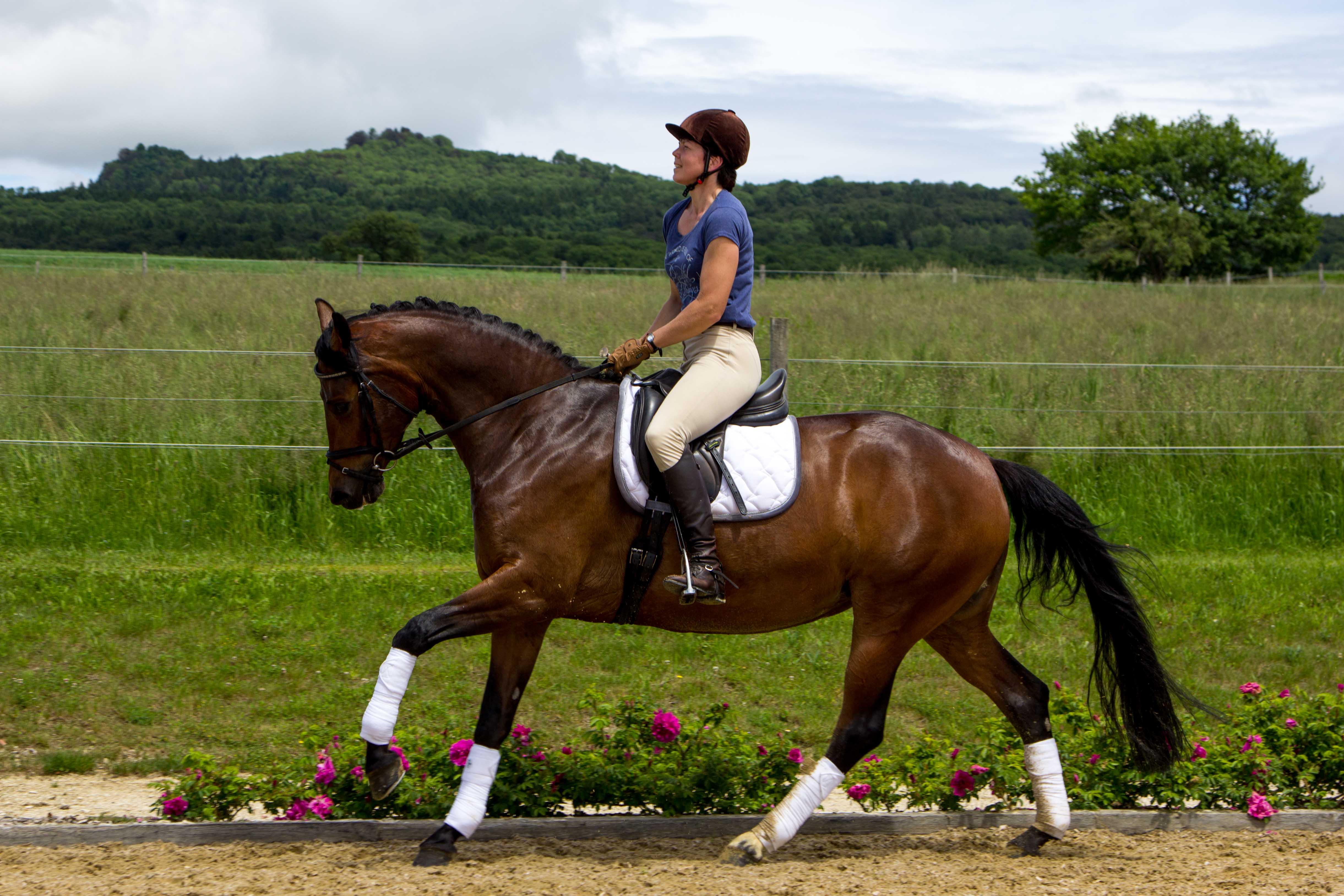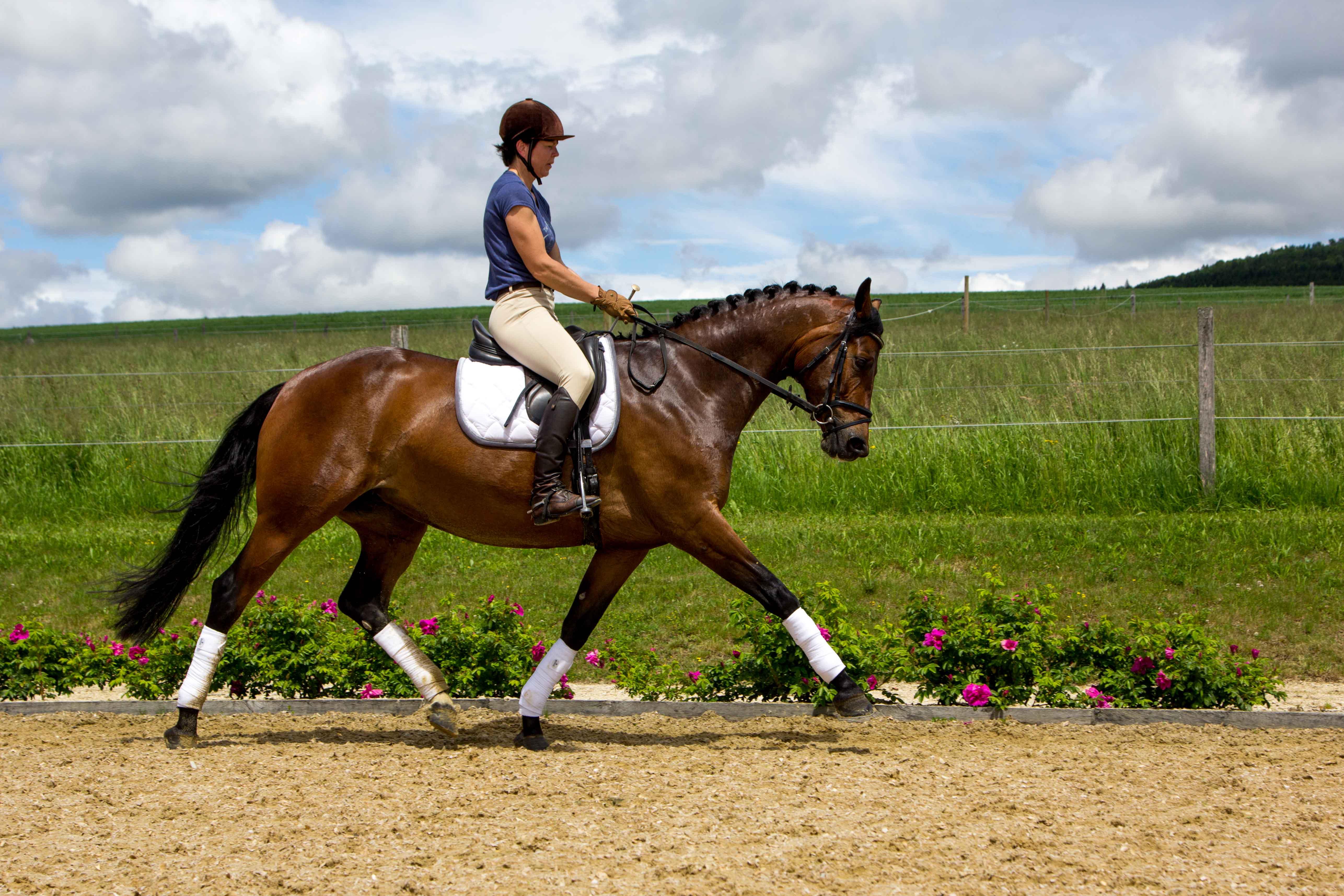 Altersgemäße Grundausbildung (Dress./Springen/Gelände); gute Grundgangarten; brav im Gelände. Schmiede- und verladefromm. Vertrauensvoll im Umgang; im Herdenverband aufgewachsen.
